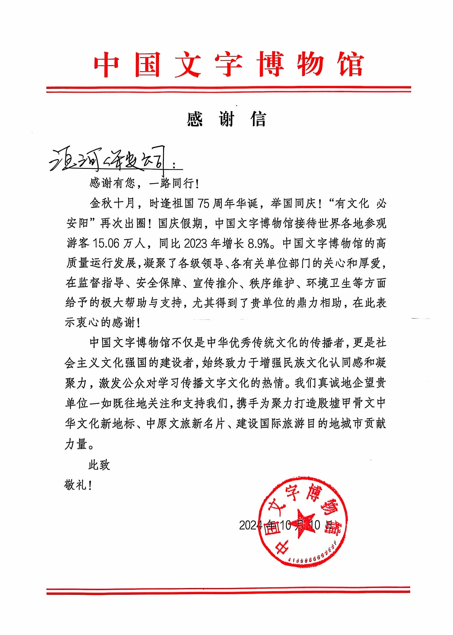 中國文字博物館自2009年建成至今與我公司已合作了15年之久,長期以來給予我公司保安服務工作以大力支持,下一步我們將繼續(xù)為中國文字博物館提供優(yōu)質的保安服務,不忘初心,再接再厲,不斷提升“洹河保安”的良好形象。