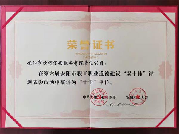 為深入學(xué)習(xí)貫徹習(xí)近平新時(shí)代中國(guó)特色社會(huì)主義思想和黨的十九大精神,積極踐行社會(huì)主義核心價(jià)值觀,進(jìn)一步提升職工職業(yè)道德建設(shè)水平,為決勝全面建成小康社會(huì),加快實(shí)現(xiàn)“一個(gè)重返、六個(gè)重大”目標(biāo)任務(wù),建設(shè)新時(shí)代區(qū)域性中心強(qiáng)市作出新的更大貢獻(xiàn),日前,經(jīng)安陽(yáng)市“雙十佳”評(píng)委會(huì)評(píng)審,中共安陽(yáng)市委宣傳部、安陽(yáng)市總工會(huì)決定:授予安陽(yáng)市洹河保安服務(wù)有限責(zé)任公司“安陽(yáng)市職業(yè)道德建設(shè)十佳單位”榮譽(yù)稱號(hào)。