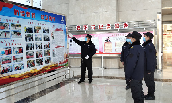 目前,中隊(duì)全體隊(duì)員表示,要以飽滿的工作熱情積極工作,保障客戶安全,為客戶度過一個(gè)平安祥和的春節(jié)做出自己的貢獻(xiàn)。圖為隊(duì)員在學(xué)習(xí)疫情防控知識(shí)、對(duì)崗點(diǎn)進(jìn)行消殺、測(cè)量外來人員體溫。