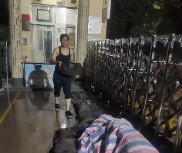 零點(diǎn)五十分,雨勢(shì)突然變大,短短十幾分鐘的雨量,已經(jīng)把學(xué)校門口的慢車道全部淹沒,積水馬上就要涌入校園。雨情就是警情,汛情就是命令。防汛排險(xiǎn),刻不容緩。何濤立刻打上雨傘,開始用防汛沙袋封堵大門,由于雨下的很急,雨傘多次被打落,他直接把雨傘扔到一邊,雙手搬起了沙袋,很快便壘起了一面沙墻,及時(shí)將雨水堵在校門之外。