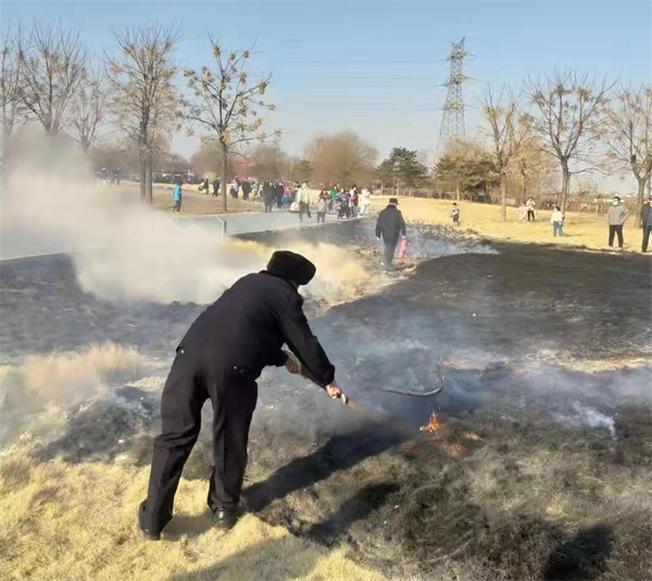 2月19日下午4點(diǎn),人防四大隊(duì)殷都區(qū)文廣新局保安班長(zhǎng)王俊峰和隊(duì)員郝彥軍像往常一樣,按照規(guī)定的線路執(zhí)行安保巡邏,當(dāng)他們?cè)谝笮骈T口巡邏執(zhí)勤時(shí),發(fā)現(xiàn)殷墟廣場(chǎng)前草坪上冒起濃濃黑煙,有火險(xiǎn),他們隨即趕到火險(xiǎn)現(xiàn)場(chǎng),班長(zhǎng)王俊峰和郝彥軍隨手撿起地上的木棍進(jìn)行滅火,王俊峰通知郝彥軍趕快上報(bào)殷墟警務(wù)室,殷墟警務(wù)室王隊(duì)長(zhǎng)得知后,立即帶領(lǐng)警務(wù)室所有隊(duì)員拿著滅火器趕到現(xiàn)場(chǎng)進(jìn)行滅火。由于發(fā)現(xiàn)及時(shí),在大家的共同努力下,將草坪上的明火撲滅。
