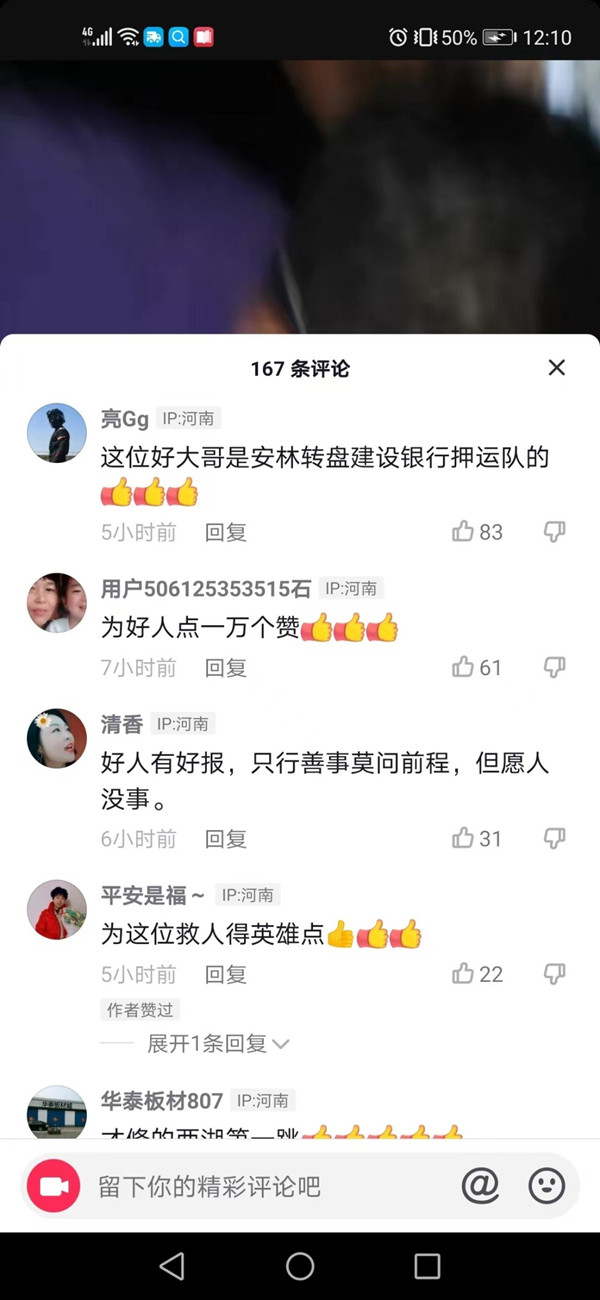 6月6日晚10時30分左右,韓海根、劉玉峰、張彩軍、徐現(xiàn)強等四人下班后前往林州龍湖散步遛彎。當(dāng)行至涼亭下面時,他們聽見“撲通”的落水聲,韓海根隱約看到附近的一位紅衣女子跳下了龍湖,他們借著夜色發(fā)現(xiàn)該女子在水里掙扎,此時,韓海根、劉玉峰、張彩軍、徐現(xiàn)強四人迅速趕到落水點查看情況,旁邊已經(jīng)有路人在圍觀,但卻沒人下去營救,此時,隊員徐現(xiàn)強立即跳下去前去營救,韓海根、劉玉峰、張彩軍打開手機電源為其進行照明指揮,經(jīng)過大家的努力,成功將落水女子救了上來。此時有路人已經(jīng)撥打了120和報警電話,救護車趕到后,四人合力又將落水女子抬上了救護車,路邊的群眾紛紛為其四人的行為點贊,并被路邊群眾拍攝視頻上傳到了抖音上,贊揚他們弘揚了社會正氣,傳遞了社會正能量,為四人的挺身而出和俠義之舉點贊。