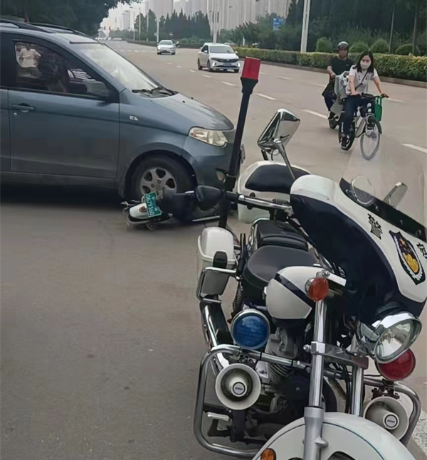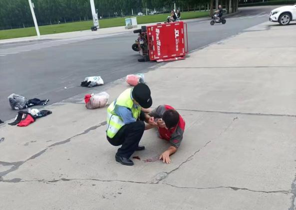 7月15日下午3點,特保大隊四中隊隊員宋超、侯振國巡邏來到弦歌大道與平原路交叉口時,發(fā)現(xiàn)該地發(fā)生一起交通事故,一輛出租車與三輪快遞車相撞。隊員們迅速停下查看情況,只見快遞哥額頭上流血不止,宋超迅速從口袋中掏出衛(wèi)生紙幫快遞哥傷口止血。隨后,他們通知隊員司清瑄、郭東梁前來支援。