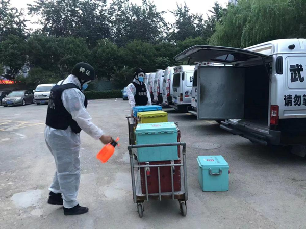 9月8日,因醫(yī)院提供現(xiàn)金支持需從人行取款,段俊杰隊長親自擔任押運司機,與其余隊員組成兩個車組,共同為范圍遍布大半個安陽市區(qū)的七個網(wǎng)點提供押運勤務(wù)支持。從早晨出車一直忙碌到中午一點,回行簡單吃過工作餐、稍事休息后,又繼續(xù)投入到緊張的押運工作中。勤務(wù)完成后,為確保駐地疫情防控安全,大家對出勤車輛及辦公區(qū)域進行全面消殺,切實把疫情防控工作做嚴密做扎實。