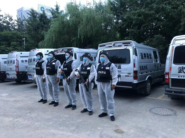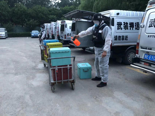 為確保守押隊員人身安全,同志們按照《疫情防控期間押運應急工作預案》,嚴格執(zhí)行辦公區(qū)域和押運車輛的消殺、防護裝備的檢查與消毒等防疫程序,執(zhí)行勤務(wù)時身穿全套防護服。