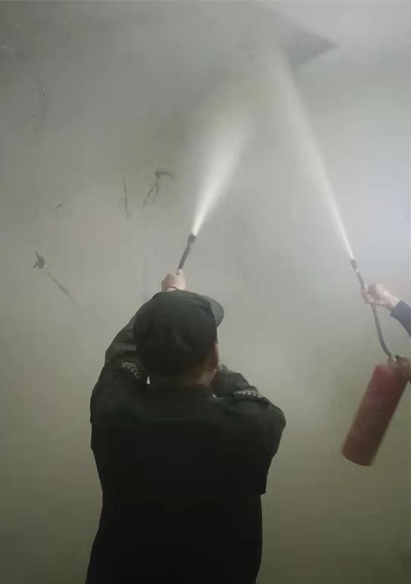 此時(shí),有的老師打了119報(bào)警電話。隊(duì)員們和校長(zhǎng)、老師齊上陣,經(jīng)過(guò)奮力撲救,火勢(shì)得到了控制。正當(dāng)他們剛要松口氣時(shí),發(fā)現(xiàn)二樓還有火情,原來(lái)是火苗順著電線蔓延到了二樓泡沫簡(jiǎn)易房。滅火器用完了,隊(duì)員們拉起消防栓進(jìn)行滅火。等消防隊(duì)趕到時(shí),基本已將明火消滅。