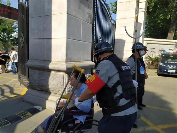 期間,一名開高的考生,因腿受傷不能行走,家長用車子送至一中大門口。保安班長王鳳銀見狀后,主動跟家長和學校溝通后,帶領隊員接過了護送該考生進入考場的任務。他們用一中的輪椅,把考生送至考場外,聯(lián)系老師送至考場內(nèi),考試結(jié)束后,再把考生接出送至大門口。