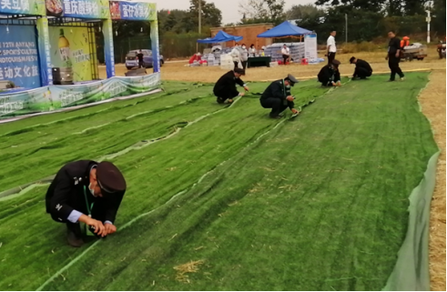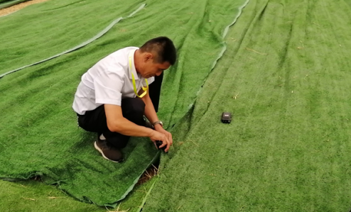 被抽調(diào)出的執(zhí)勤人員分工合作,有的負(fù)責(zé)鋪平草坪地毯,有的負(fù)責(zé)將地毯用訂書釘釘在一起,大家干得熱火朝天。經(jīng)過2個多小時奮戰(zhàn),13500平方米凌亂的草坪地毯再次整整齊齊鋪在了主會場??蛻艨吹胶螅笨湮覀兊谋0矄T真能干。