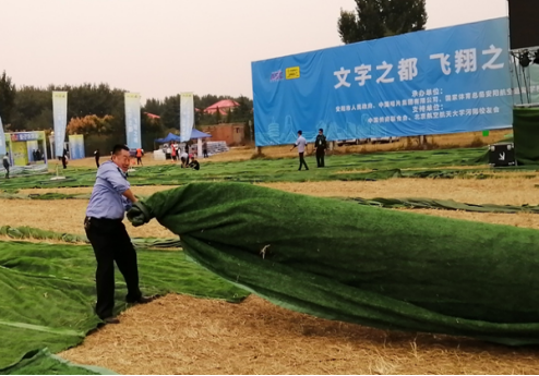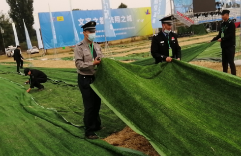 “把這邊拉整齊?!薄拔疫@里已經(jīng)鋪平了?!?月30日下午,第十二屆安陽航空運動文化旅游節(jié)主會場,在執(zhí)勤的公司保安員應(yīng)客戶要求忙著整理會場上草坪地毯。