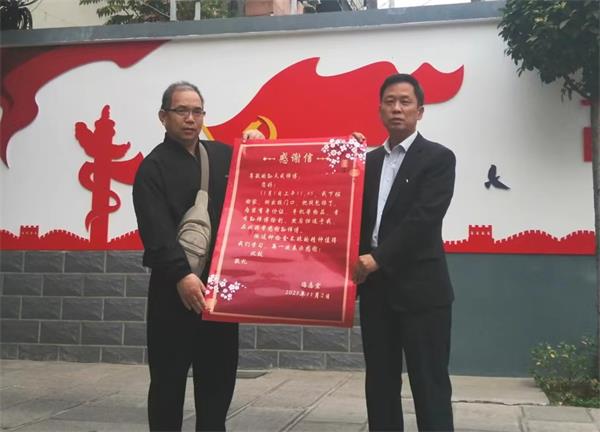 2023年11月3日上午10:30許,人防二大隊收到一封印刷體的感謝信。感謝信由失主愛人馮先生專程送達,表揚了校園保安孫天成拾金不昧的事跡。