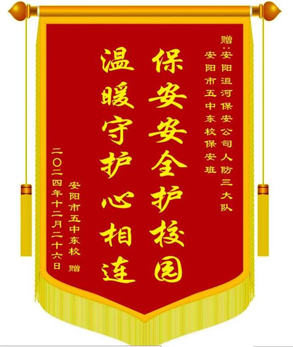 12月27日上午10時許,安陽市五中東校有關領導專程將一面寫有“保安安全護校園 溫暖守護心相連”的錦旗和一紙表揚信送到公司,感謝公司人防三大隊派駐學校保安班一直以來對維護校園平安所作出的辛勤努力和付出,營造了安全、有序、文明、和諧的環(huán)境,為構筑平安和諧校園作出了重要貢獻。