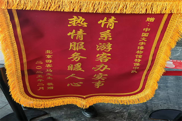 2月16日,一名北京游客將一面“情系游客辦實事 熱情服務(wù)暖人心”的錦旗送到特保大隊派駐中國文字博物館特保中隊,表達(dá)對特保隊員不顧恐高、幫助找到墜落無人機(jī)的感激之情。
