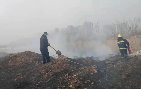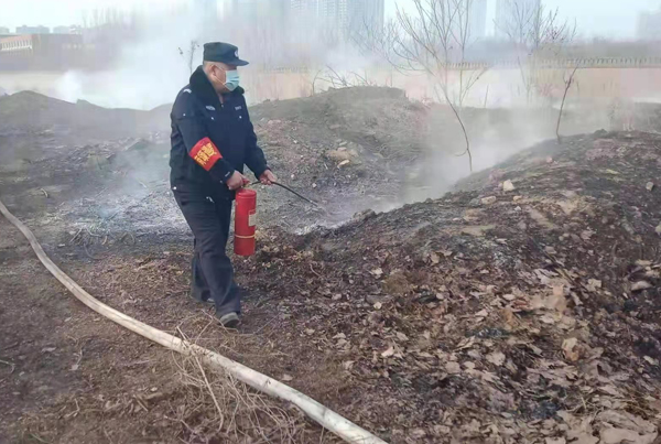 上午9時許,保安員屈國營、郭慶陽、李海軍、申安民巡邏至轄區(qū)中華路王官屯北路時,看到路邊防護林草叢正在燃燒,由于天干物燥,火勢蔓延很快。隊員立即引導旁邊群眾疏散,撥打119消防電話報警,并從車上拿出滅火器冒著滾滾濃煙,全力撲滅大火,盡最大努力防止大火蔓延,避免造成更大的損失。雖然灰燼落滿了全身、汗水濕透了衣背、濃煙模糊了雙眼,但保安員依然斗志昂揚、毫不畏懼。很快,消防救援人員趕到,保安員又配合消防人員,終將燃燒的干草撲滅。