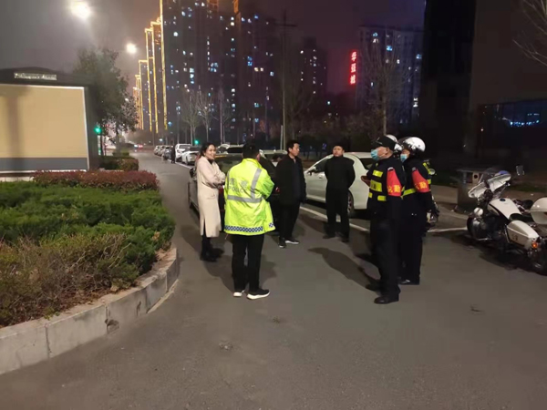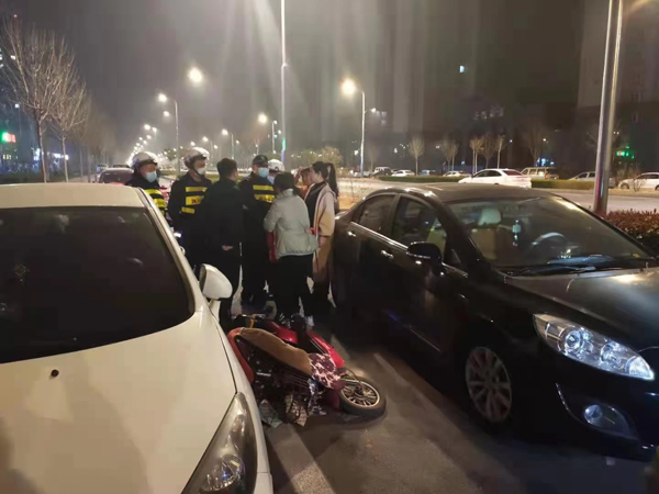 3月14號(hào)晚上8點(diǎn)40分左右,人防一大隊(duì)派駐高新區(qū)分局巡防隊(duì)徐強(qiáng)、郝文佺,閆志強(qiáng),孫守偉,宋立等5名隊(duì)員在轄區(qū)巡邏,行至開(kāi)發(fā)區(qū)佳田未來(lái)城小區(qū)西門(mén)非機(jī)動(dòng)車(chē)道看到一起交通事故。當(dāng)時(shí),事故雙方情緒激動(dòng),在激烈爭(zhēng)吵,還有一名小孩受輕傷。