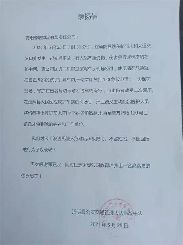 據(jù)悉,6月3日下午,湯陰縣公安交通管理大隊事故中隊工作人員曾帶著一封表揚信來到安陽豫煙物流公司,感謝邢衛(wèi)波,對邢衛(wèi)波見義勇為,積極救助傷者的行為予以表揚。