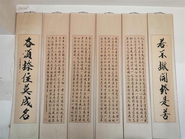 杜先生家大門朝東,坐落在村東一處較為平緩的崗地,頗具靜水流深、紫氣東來之神韻。這里儼然是一處天然氧吧,門前開闊地東側(cè),是一片蔥郁的樹林,林中不知名的鳥兒發(fā)出歡快的叫聲,好像和主人一起歡迎客人的到來。我們隨主人進(jìn)院來到北屋,一股書香氣撲面而來,正門墻上一組行書四扇屏字畫映入眼簾,上書孔子老先生教誨的九思,兩側(cè)是一副醒目的對聯(lián):若不撇開終是苦,各須捺住莫成名。