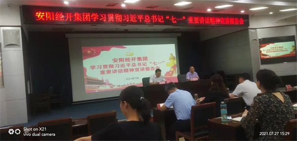 2021年7月27日下午,安陽(yáng)市洹河保安公司黨委組織10名黨員干部,參加了由中共安陽(yáng)經(jīng)開(kāi)集團(tuán)黨委舉辦的學(xué)習(xí)貫徹習(xí)近平總書(shū)記“七一”重要講話精神宣講報(bào)告會(huì),會(huì)議邀請(qǐng)河南護(hù)理職業(yè)學(xué)院馬克思主義學(xué)院副院長(zhǎng)、副教授張艷林主講,會(huì)議由經(jīng)開(kāi)集團(tuán)黨委書(shū)記、董事長(zhǎng)齊方同志主持。
